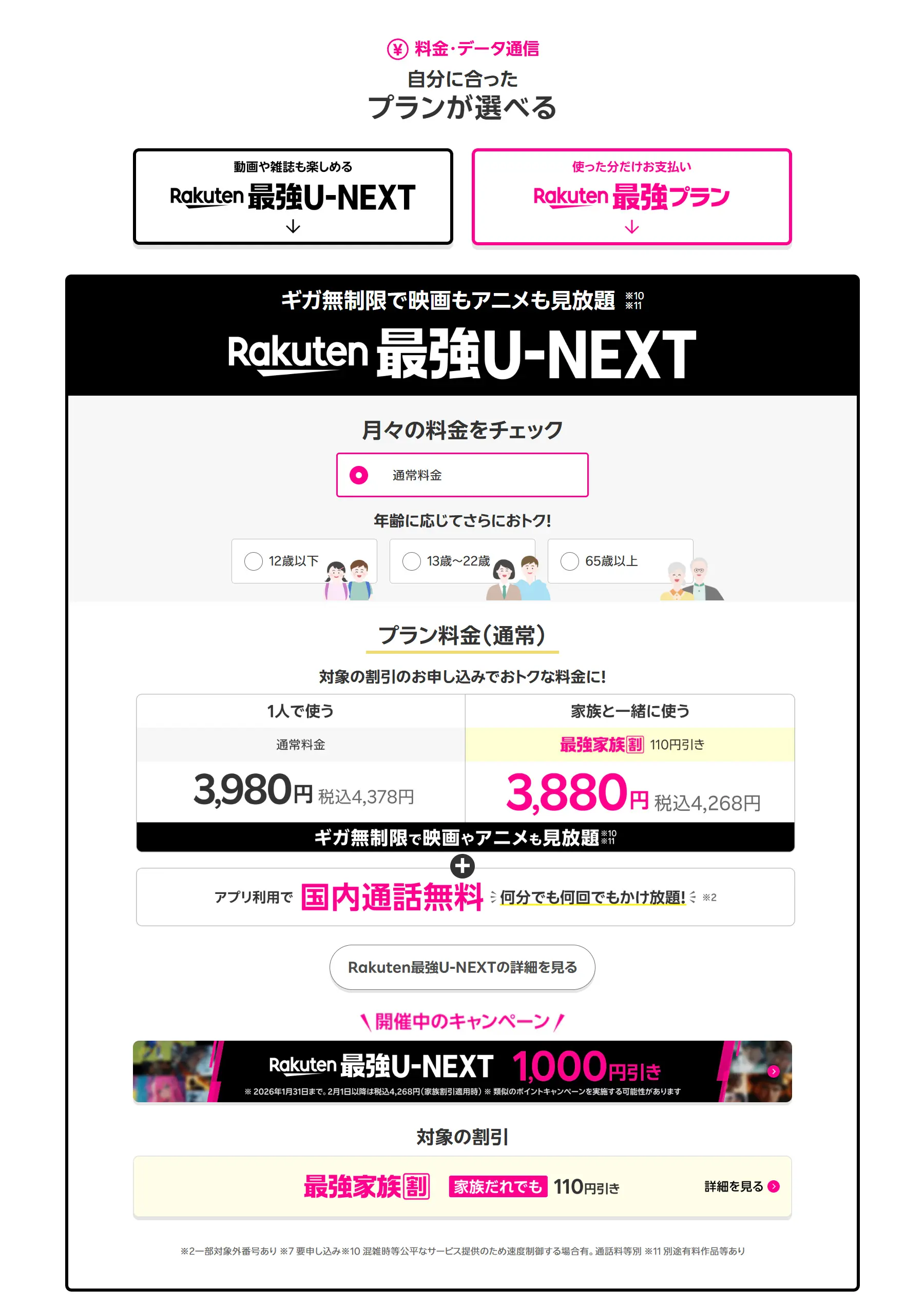 ※2026年1月現在は「Rakuten最強U-NEXT」という「Rakuten 最強プランとU-NEXTがセットになったおトクなプラン」が存在するが、通常のU-NEXT契約で付与される1,200円分のU-NEXTポイントは進呈対象外らしいので要注意