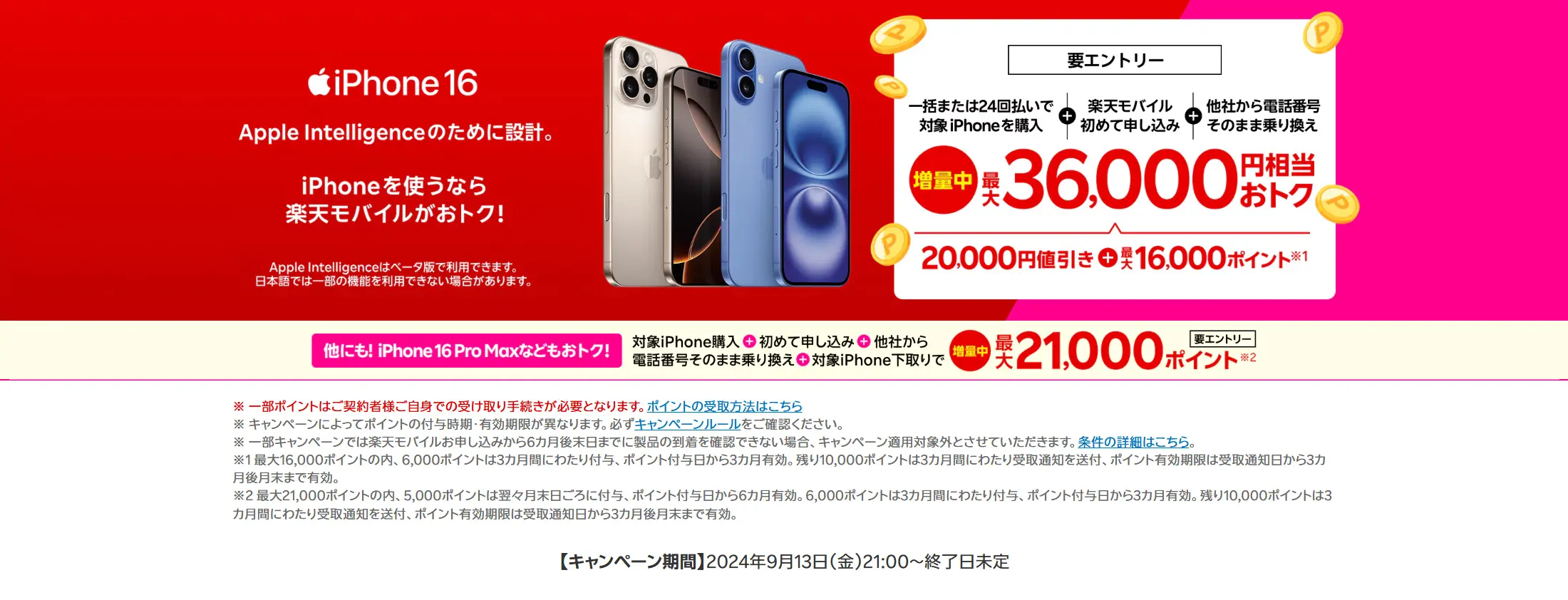 - 最大36,000円分相当おトク!(Rakuten最強プラン新規契約&iPhone 16|16Pro(128・256GB)購入&他社から乗り換えのポイント合計)