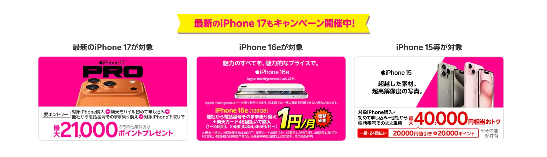 - 最大21,000ポイント還元!(エントリー後他社から乗り換え&Rakuten最強プラン新規契約&iPhone 17|17Pro|17Pro Max|Aire購入&スマホ下取りサービスポイント合計)