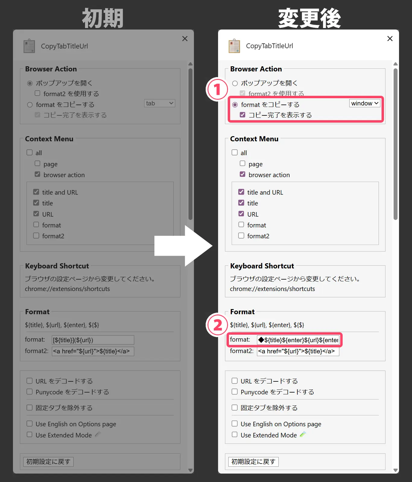 アイコンクリック後すぐに「Window内タブのタイトル+URLを一括コピー」をするための設定